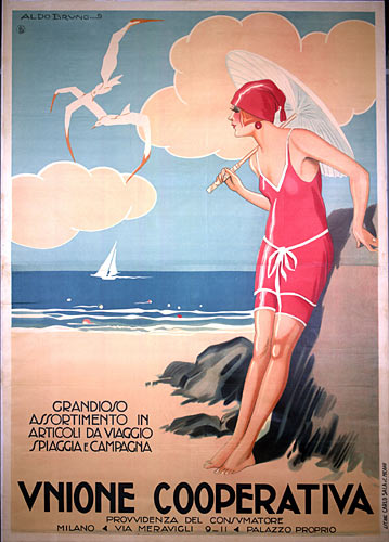 Aldo Bruno [Aldo De Luca] (dati biografici non noti) 1912 Unione Cooperativa. Provvidenza del consumatore Grandioso assortimento in articoli da viaggio spiaggia e campagna Litografia a colori Lit. Rag. Carlo Sala & C. Milano 1970x1400 mm